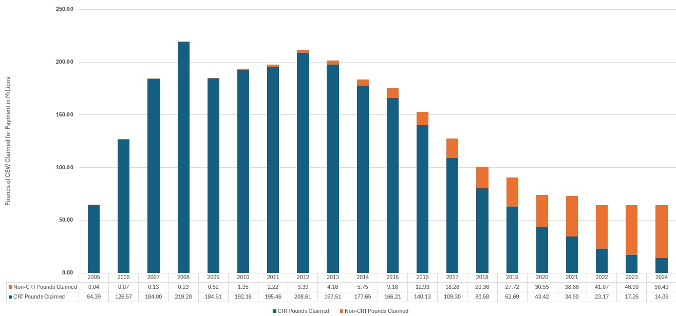 2005-2024 Pounds of CRT and Non-CRT CEW Claimed for Payment